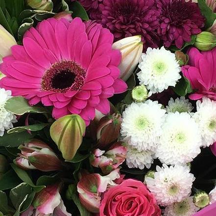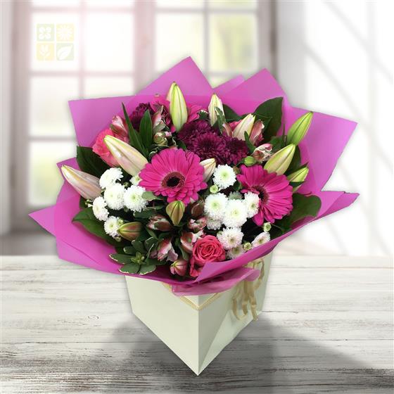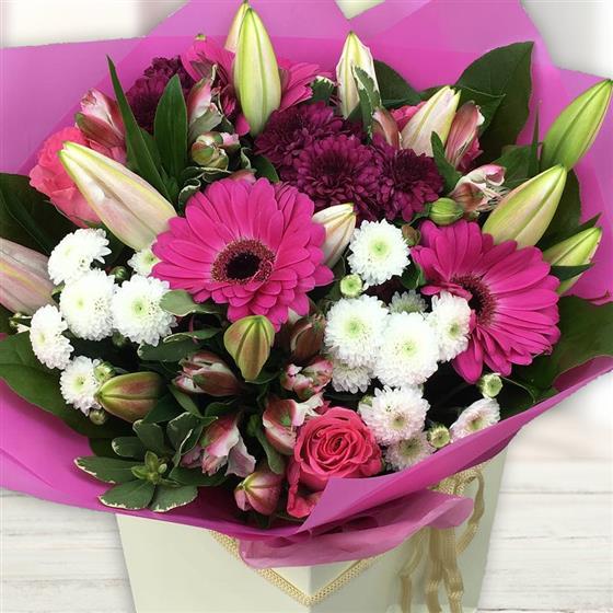 This elegant bouquet blends budding oriental lilies, cerise gerberas, pink alstroemeria, spray roses, white button chrysanthemums and deep plum blooms, beautifully presented for a charming, sophisticated gift.