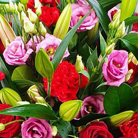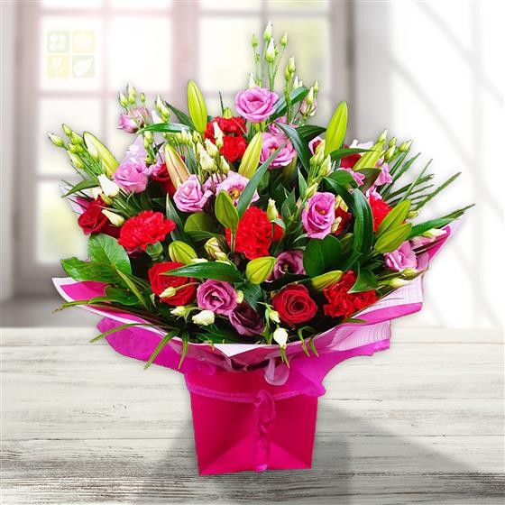 Blush pink lisianthus, scarlet carnations, deep-red roses and tender lilies nestle in verdant foliage, wrapped in soft tissue for a gentle, romantic flourish.
