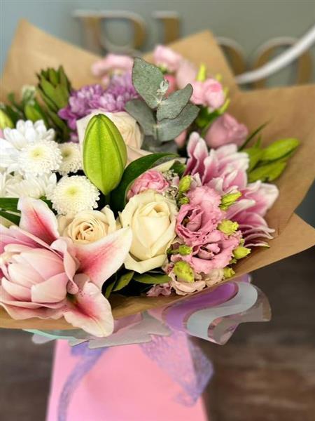 A fresh pink, ivory and soft lilac flower bouquet with lilies, roses, spray chrysanthemum, lisianthus, seasonal stems and foliage, arranged using fresh flowers and natural style,