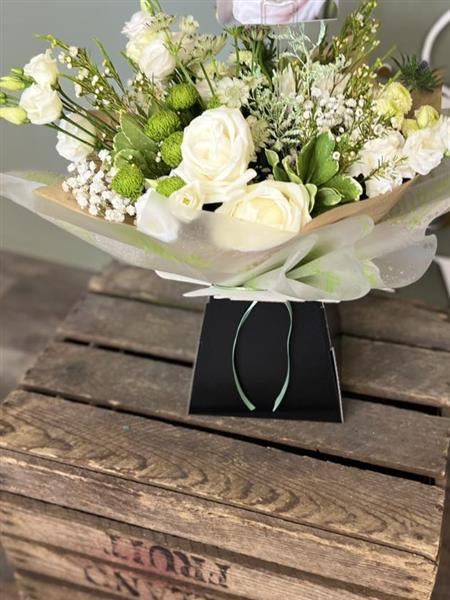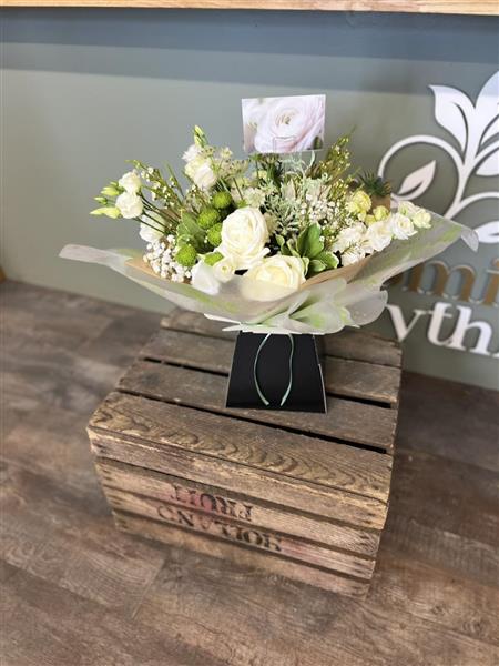 A fresh white and green flower bouquet with roses, spray roses, chrysanthemum, gypsophila, seasonal stems, natural textures and foliage, arranged using fresh flowers and natural style, available for local same day delivery.