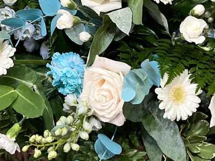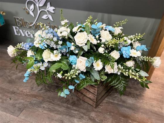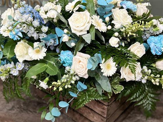 Calm blue and white Casket spray