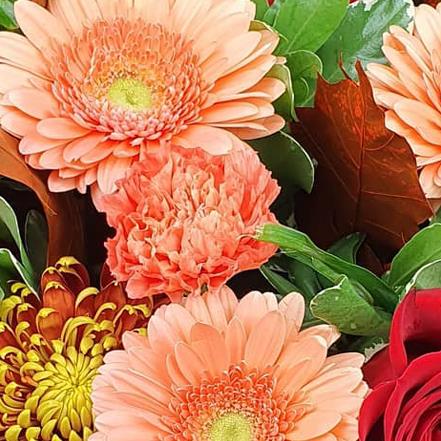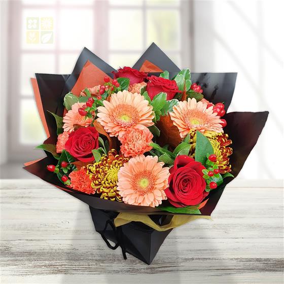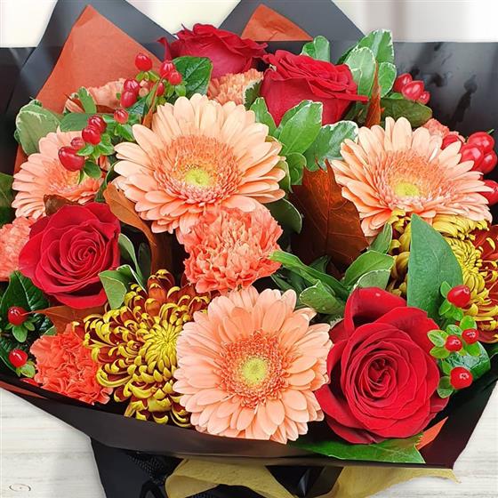 A warm, seasonal flower bouquet blending peach gerberas, rich red roses and textured chrysanthemum blooms. Finished with berries and foliage, this design has a cosy, autumnal feel with strong colour and depth.