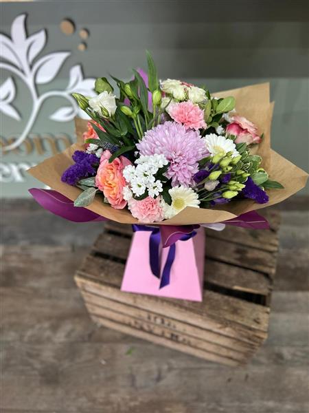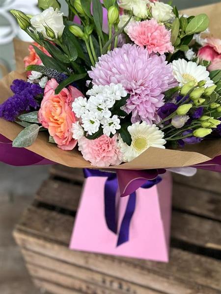 A fresh pink, lilac, peach and ivory flower bouquet with roses, chrysanthemum, germini, carnations, seasonal stems and foliage, arranged using fresh flowers and natural style, available for local same day delivery.