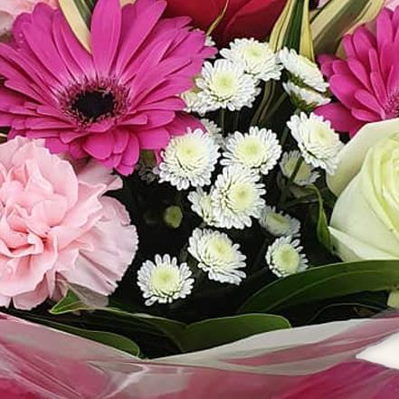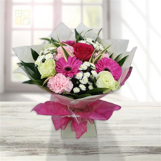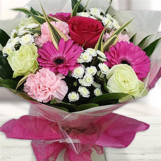 A joyful burst of colour and elegance, this hand-tied bouquet brings together vibrant pink gerbera daisies. Cream roses, delicate carnations and crisp white chrysanthemums, lets not forget the the deep red rose also, finished off in lovely lush foliage to add texture and freshness,