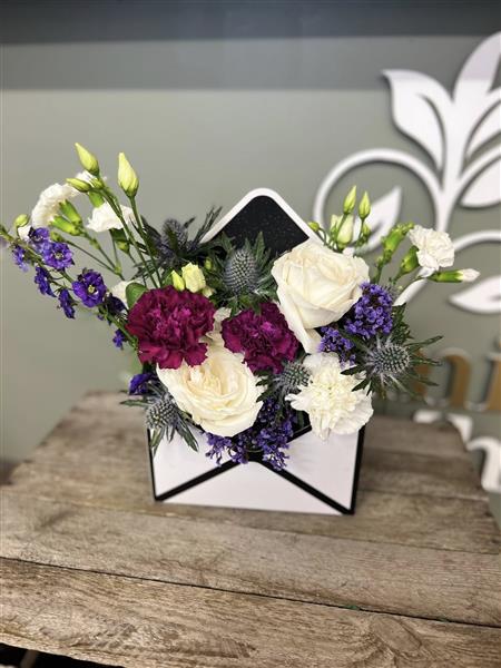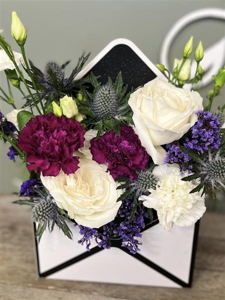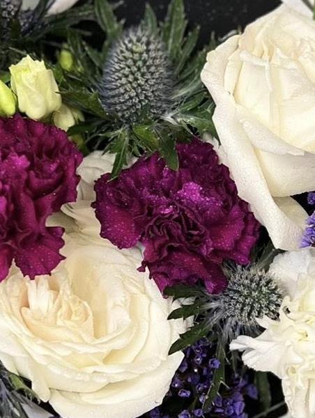 A fresh ivory and deep berry toned flower arrangement with roses, carnations, thistle and seasonal stems, arranged using fresh flowers and natural style, available for local same day delivery.