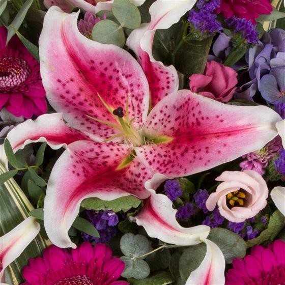 Scented stargazer lilies are the focal feature in this striking posy arrangement. Please give ample time when ordering to ensure lilies are in full bloom.